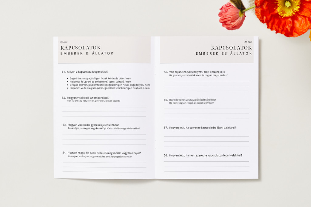 Egy strukturált, több mint 60 oldalas füzet kérdésekkel, amiket még soha senki nem tett fel a kedvenceddel kapcsolatban.